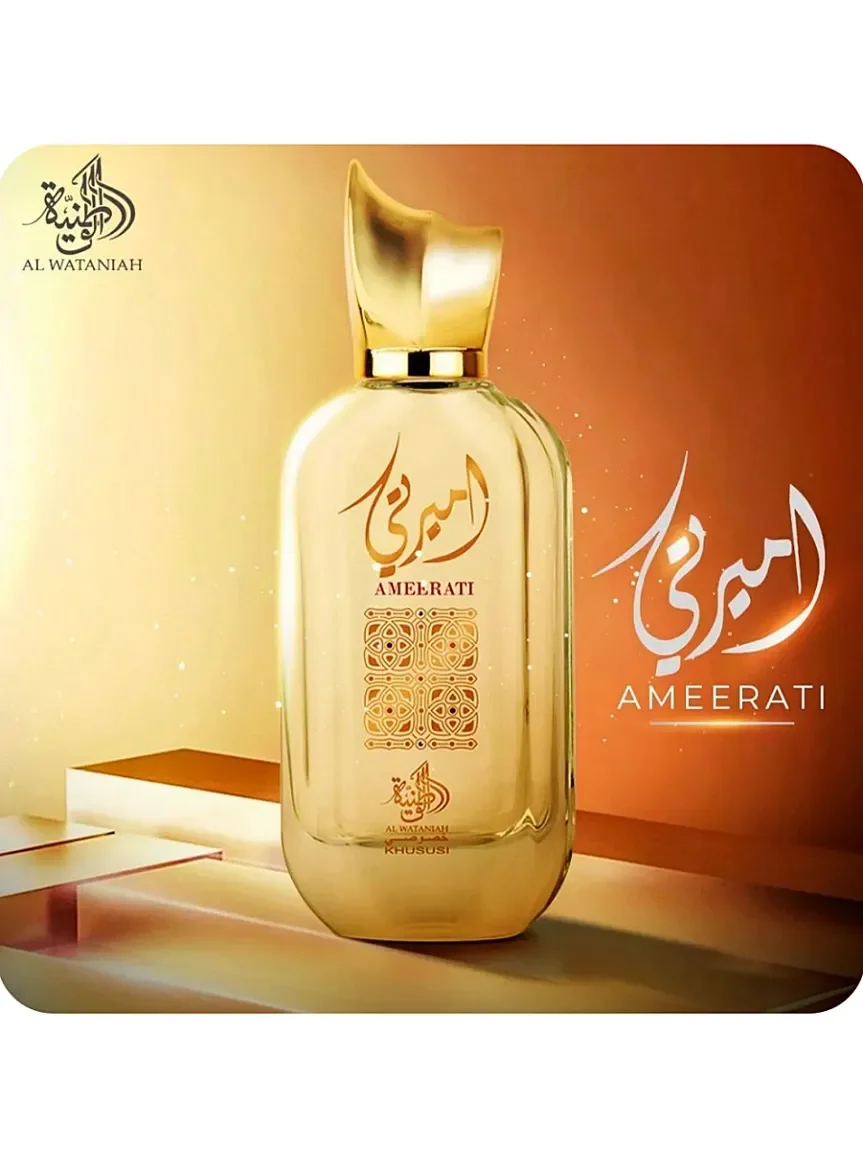 Ameerati Eau De Parfum de Al Wataniah com notas cítricas e almíscar complementadas por aromas frescos e amadeirados. Este perfume traz para você a experiência autêntica de ser um verdadeiro Emirati enquanto este perfume envolve você e o anima, mostrando seus sonhos de areia dourada.